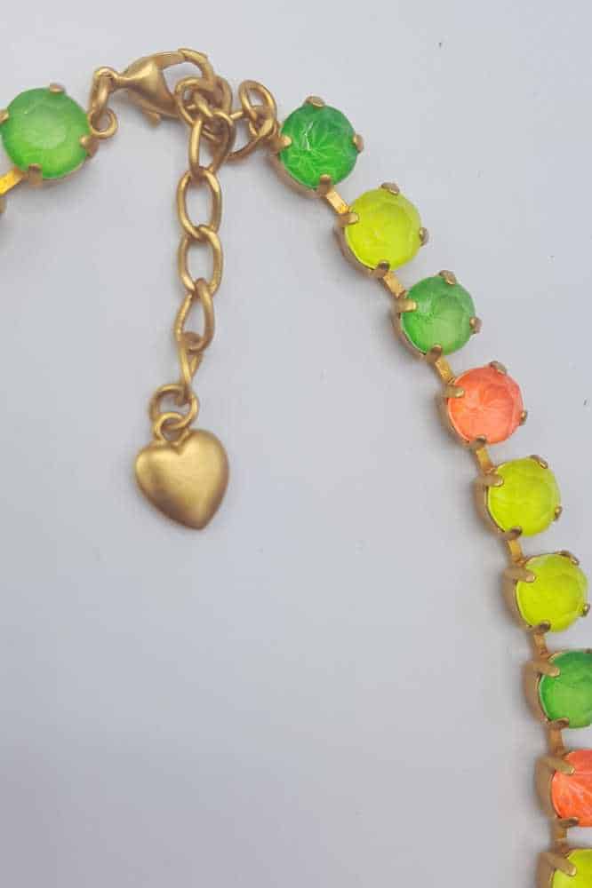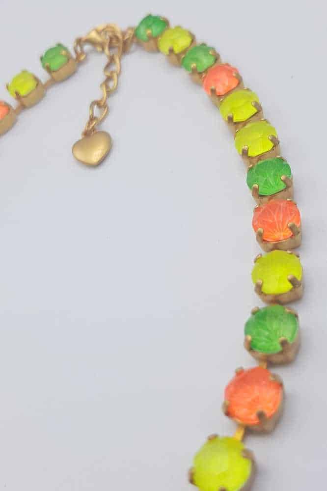 De Luna Matte Gold LMG105 Neon Orange ketting van Nell Bijoux straalt luxe en elegantie uit en wordt met de hand vervaardigd in ons eigen atelier. Elke ketting is uniek, met een prachtig samenspel van kleuren en diep schitterende Swarovski-kristallen. De matte gouden afwerking en de prachtige, nikkelvrije legering zorgen voor een stijlvolle uitstraling en langdurige kwaliteit. Perfect voor elke gelegenheid en beschikbaar in meerdere kleurstellingen. Voeg een unieke, persoonlijke touch toe aan je sieradencollectie met deze verfijnde ketting.