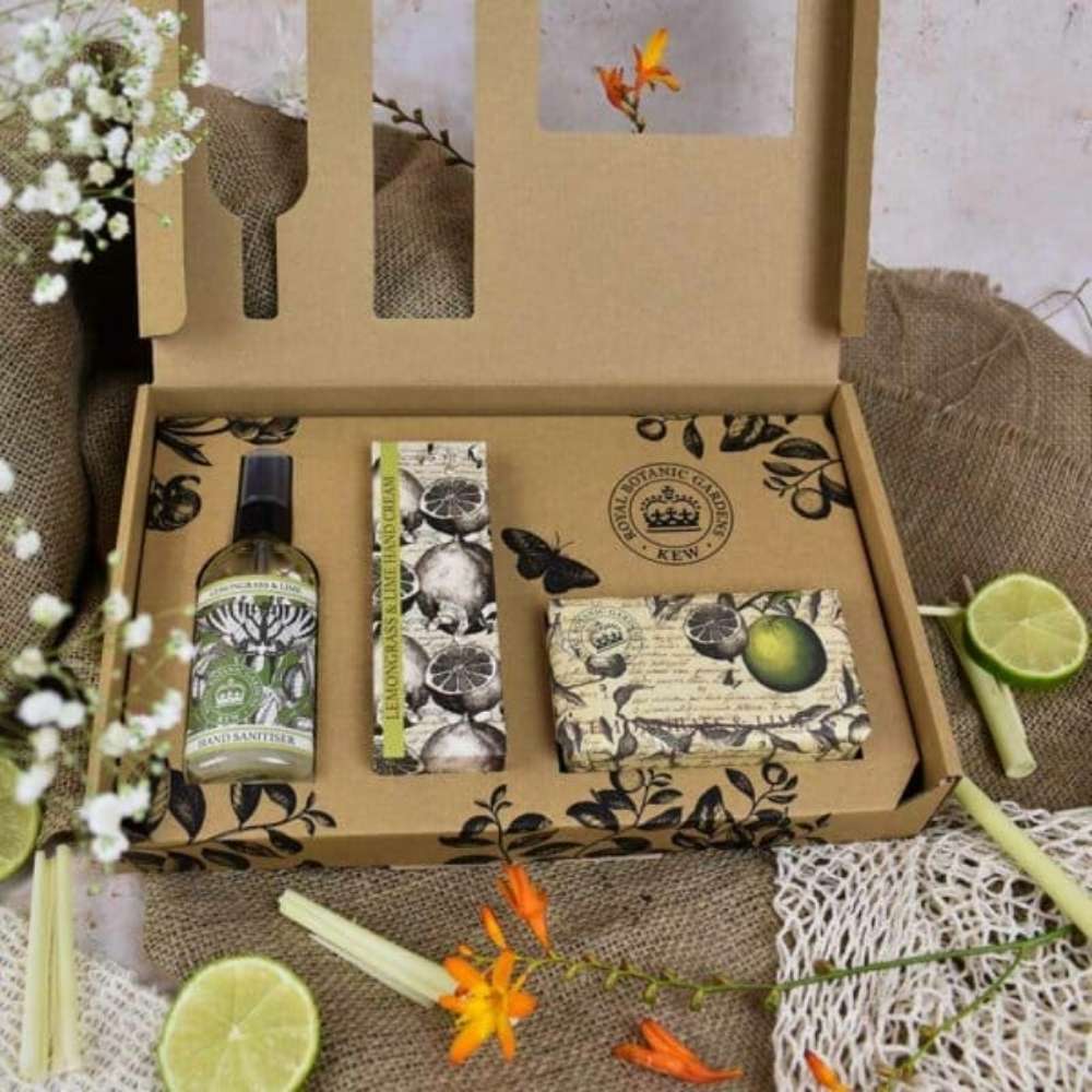 Verwen iemand van wie je houdt met een Kew Gardens Lemongrass and Lime Hand Care Gift Box. Reinig, hydrateer en desinfecteer met een stuk zeep van 240 g, handcrème van 75 ml en een handdesinfecterende spray van 100 ml, doordrenkt met een frisse en pittige geur met prachtige tonen van zoet en citrus. Gepresenteerd in een prachtige geschenkdoos, geïllustreerd met ontwerpen geïnspireerd op de Royal Botanic Gardens, Kew.